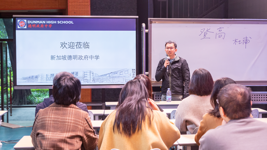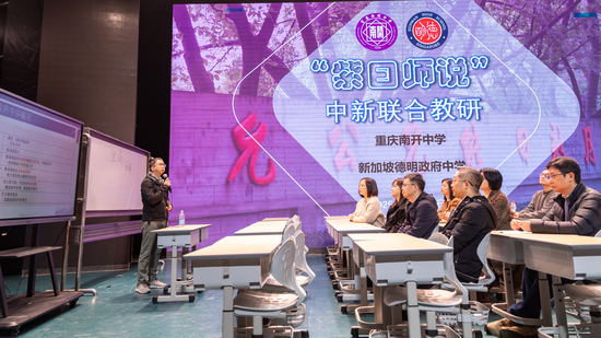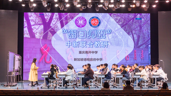 南开中学语文教师黄诗莹带来一堂精彩的《登高》公开课,以生动的课堂教学展现出古典诗词的独特魅力;新加坡德明政府中学主任刘志强系统介绍了德明政府中学的校史沿革、办学理念与教育创新成果,从“诚信勇忠”的校训精神到双语双文化的培养特色,从课程体系构建到校园文化建设,内容翔实丰富。双方教师围绕教学实践、育人模式展开深度交流,在思想的碰撞与交融中,为基础教育创新发展探寻新方向。重庆南开中学党委副书记吕珍律对两校教研交流成果予以肯定,并寄语双方持续深化教育合作,让校际互鉴的成果更好赋能基础教育发展。