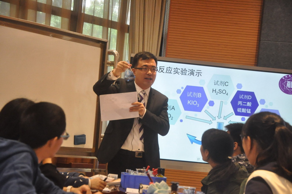 本次研讨会分为课堂展示、评课比赛、主题演讲、专家点评和才艺表演五个环节。在课堂展示环节中,南开中学的卢永忠老师和卓峻峭老师分别呈现了精彩的现场教学。卢永忠老师的《氧化剂与还原剂》展示课上,学生们一开始就被奇妙的“变色魔术”深深吸引,在对“魔术”原理分析和探究过程中,逐步建立起氧化剂和还原剂的概念,完成了课堂教学内容。卓峻峭老师展示了《碘钟反应实验探究》选修课,课上,卓老师和学生一道,从碘钟反应的现象入手,进行化学原理分析。虽然课堂涉及的化学知识已经超过高一的知识范畴,但并未妨碍学生们积极探究、克服难点、弄清原理,最终完成了神奇的碘钟反应实验。