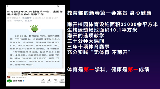 2026年2月25日,教育部召开深入落实“健康第一”工作部署会,全面部署推进学生身心健康工作。南开中学在体育锻炼、美育浸润、心理健康、近视防控、食品安全等方面全面着力,让“健康第一”成为保障学生身心发展的第一宗旨。肖力强调,体育是第一学科,健康是第一成绩。“无体育,不南开”始终是南开促进学生身心健康发展的基本理念。