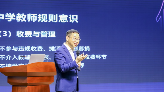 肖力提到南开中学教师规则意识时,从言行底线、教学与评价、收费与管理、校园安全、AI与网络舆情等方面进行细致深入地阐释,强调教师只有树立规则意识、底线意识才能够真正落实立德树人,并引用南开校史原文中“张伯苓戒烟”的往事,来生动说明南开文化中规则意识的深厚底蕴。