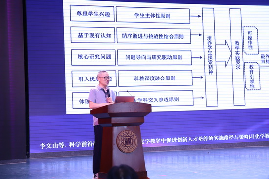 讲座聚焦高中化学教学改革方向,深度探讨前沿科技与项目式教学的融合路径。江教研员立足拔尖创新人才培养和核心素养导向教学,强调了在教学中引入前沿科技的重要性,梳理了王磊、陶丹、李文山等教授团队将前沿科技成果融入化学教学的探索研究现状。
