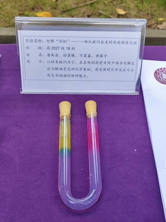 实验名称:电解“彩虹”——一场从疑问出发的实验探索之旅 班级:高2027届18班 姓名:潘禹丞、徐晨曦、万晨鑫、黄薪宇 | 实验名称:植物拓染 班级:高2027届3班 姓名:吴向南、魏嘉仪、范思成、代文煊、雷子函、刘宸睿、唐世嘉 |