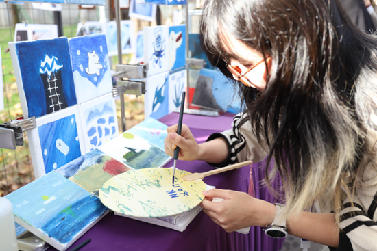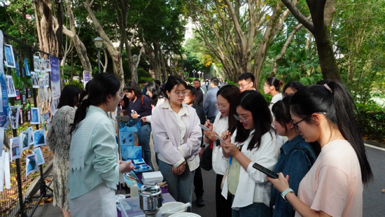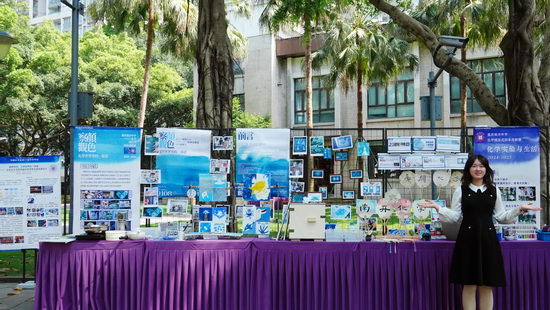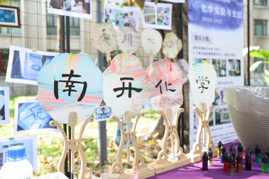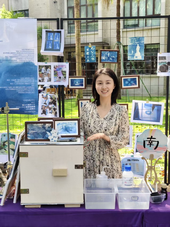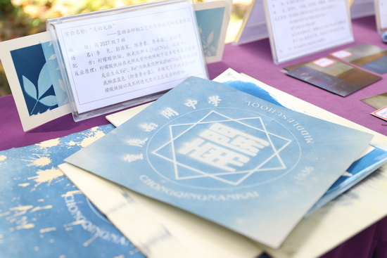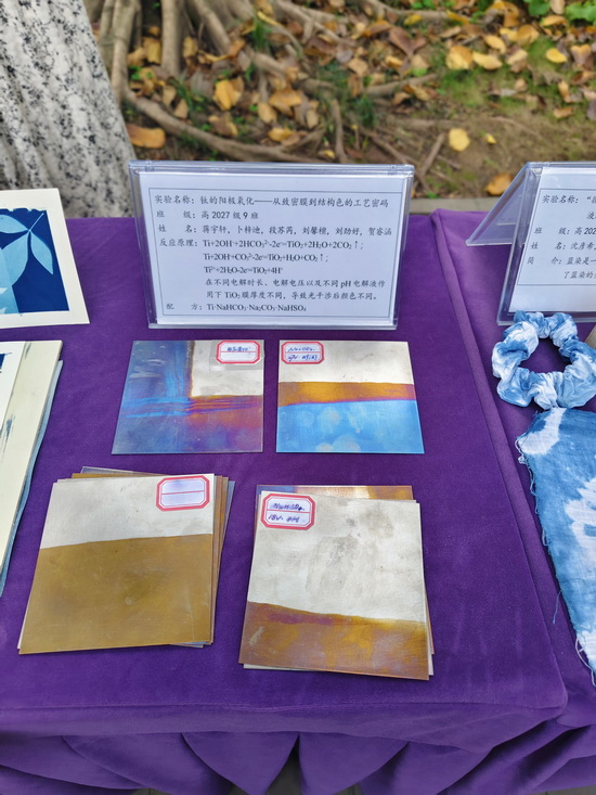 课程以“蓝色”为线索,设置“染蓝季—画蓝季—晒蓝季—追蓝季”四个递进模块。活动现场展示了“古法制群青”颜料的过程并增加了现场体验环节;同时展出了南开文创蓝晒作品和化学元素作品——将传统蓝晒印相工艺与校园文化符号相结合,让化学在艺术创作中焕发光彩。课程将科学探究与人文思辨深度融合,体现“化学不仅是一门科学,更是一种文化”的理念。