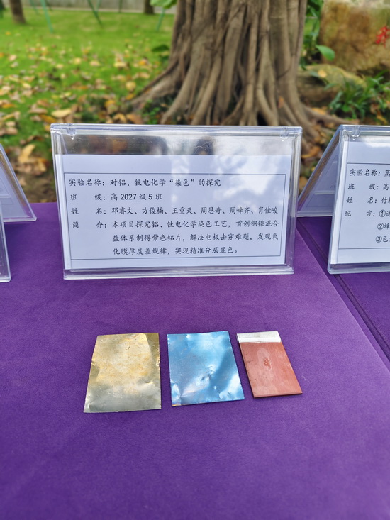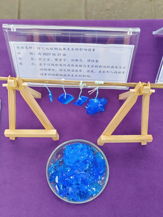 实验名称:探究硫酸铜晶体生长的影响因素 班级:高2027届21班 姓名:翁宗宝、樊星宇、刘都笃、谭梓豪 | 实验名称:对铝、钛电化学“染色”的探究 班级:高2027届5班 姓名:邓睿文、方俊楠、王重天、周恩奇、周峰齐、肖佳峻 |