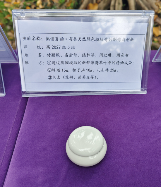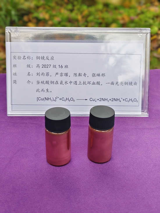 实验名称:铜镜反应 班级:高2027届16班 姓名:刘雨菲、严霏曜、陈粼奇、张琳那 | 实验名称:蒸馏夏韵·有关天然绿色驱蚊膏的制作与创新 班级:高2027届5班 姓名:付颖熙、雷翕智、陆梓涵、闫欣琳、周彦希 |