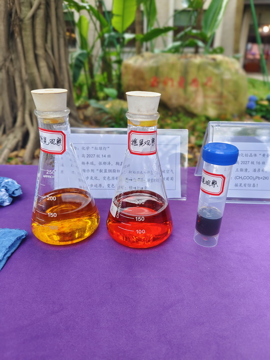 活动上,荣获南开中学化学创新实验大赛特等奖的学子代表现场汇报了《基于pH调控的CPPO荧光实验探究》《对铝、钛电化学“染色”的探究》《电解“彩虹”:一场从疑问出发的实验探索之旅》三项实验成果。同学们从实验背景、设计方案、操作流程到创新点进行了完整介绍,从原理优化、方法改良到思路突破,每一处细节都彰显着创新思维与探索精神。现场还陈列了《探究硫酸铜晶体生长的影响因素》《植物拓染》等兼具科学性与美感的实验成果。
