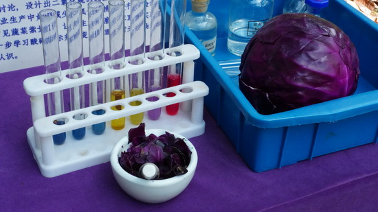 课程以真实生活问题为驱动,设置了3个平行的子项目进行探究。在“二氧化硫检测装置的设计与搭建”项目中,学生自主设计并完成从原理到实物的工程实践;在“紫甘蓝色素的提取与应用”项目中,学生亲手研磨、萃取,探究花青素作为天然酸碱指示剂的变色规律,并在现场开展紫甘蓝调色互动,让参与者直观体验pH对颜色的影响;在“大漆中的化学”项目中,现场漆扇制作生动展示了中国传统大漆工艺中的化学智慧——漆酚在空气与水分作用下发生氧化聚合形成坚韧漆膜,漂漆与“开色”过程则涉及表面张力与溶剂挥发速率的调控。课程真正实现了“从生活走进化学,从化学创造生活”。