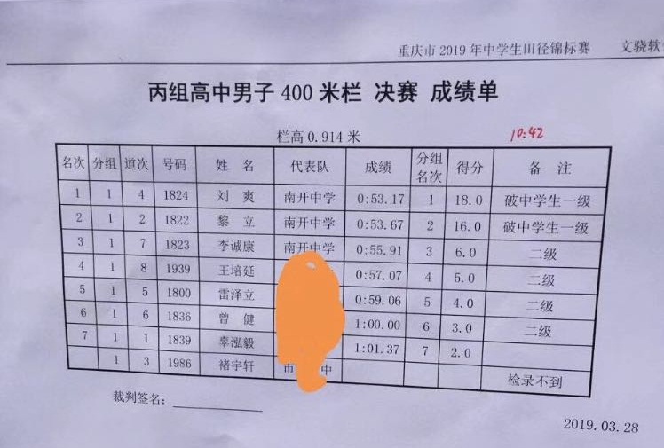 本届比赛中,南开田径队取得了令人惊艳的成绩。刘爽同学以53.17s的成绩获400米栏第一名,黎立同学以53.67s的成绩获第二名,两人均打破原重庆市中学生最高纪录53.80s。