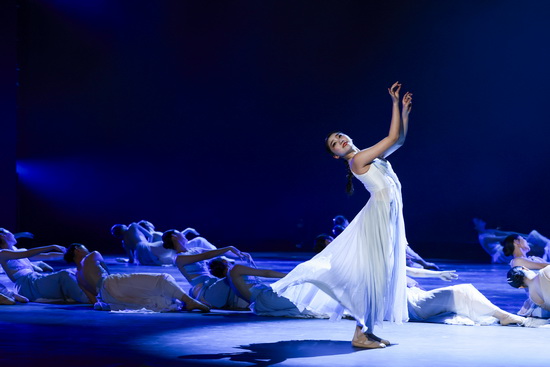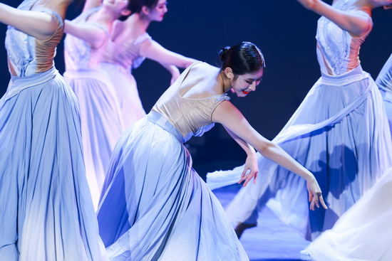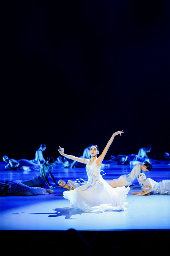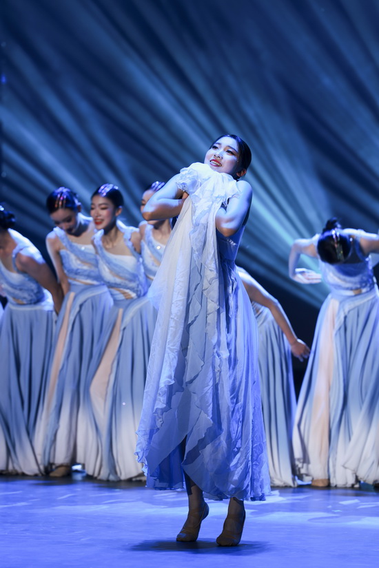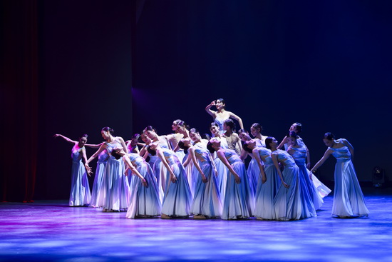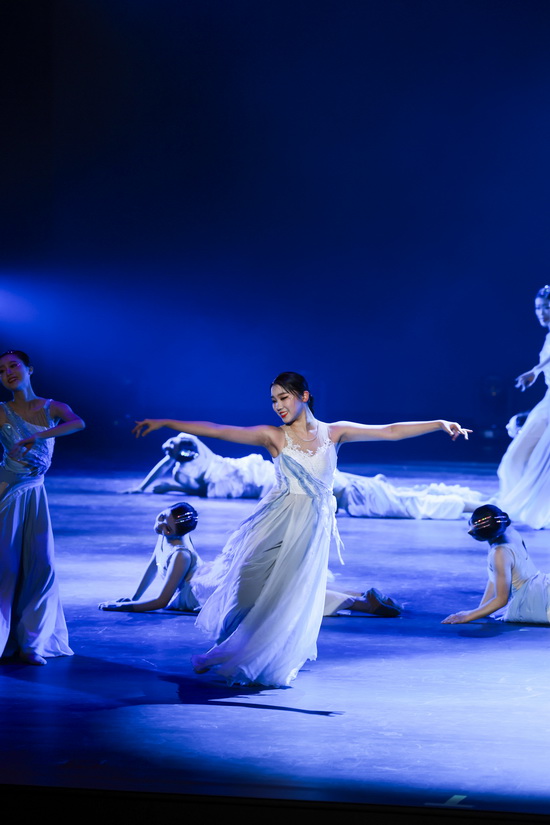 舞蹈《长嘉有风,溯洄始南》以长江、嘉陵江交汇的重庆地域文化为创作根基,将“大江泱泱,嘉陵温婉”的自然意象与巴渝人文底蕴巧妙融合。舞台上,南开舞蹈团队员身着素雅飘逸的服饰,以轻盈灵动的步伐、舒展优美的肢体,完美展现两江流水的温婉与奔腾、山城雾霭的朦胧与壮阔。她们时而如江水涟漪般轻柔荡漾,时而似惊涛拍岸般铿锵有力,每一个转身、每一次跳跃都诉说着巴渝大地的千年传奇,演绎出重庆这座山水之城的独特魅力。