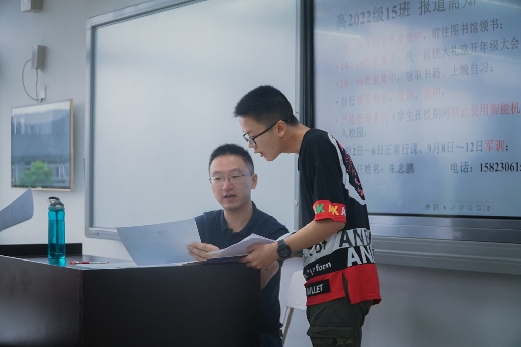 教室里,班主任老师们在讲台上等待着同学们,交各种证件、资料,回答新同学提出的各种各样的问题。位置上坐着的一张张陌生的面孔,都是接下来三年里一起成长的同窗。